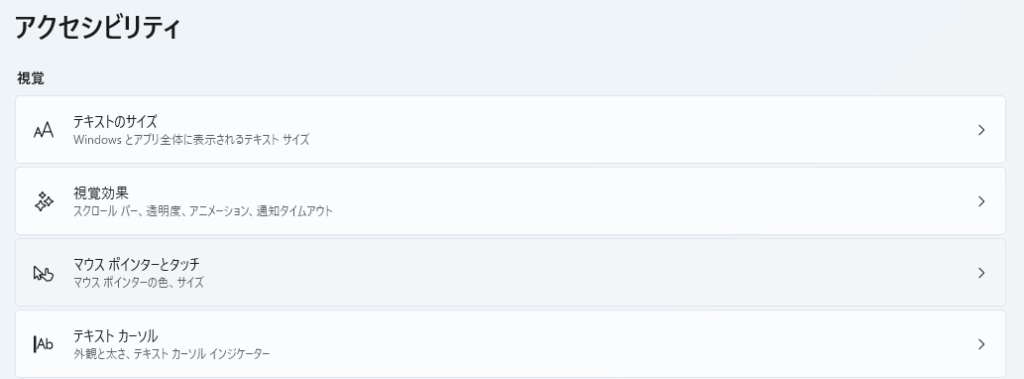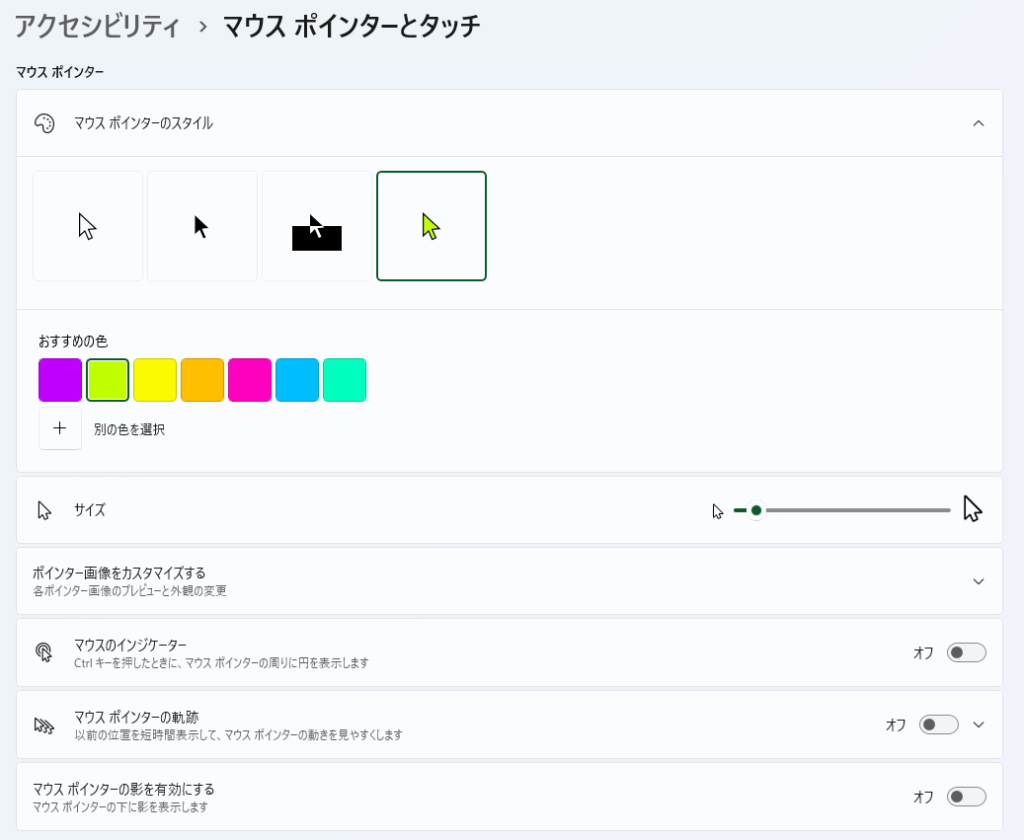 「設定⇒アクセシビリティ⇒マウスポインターとタッチ⇒マウスポインターのスタイル」から設定を変更します。